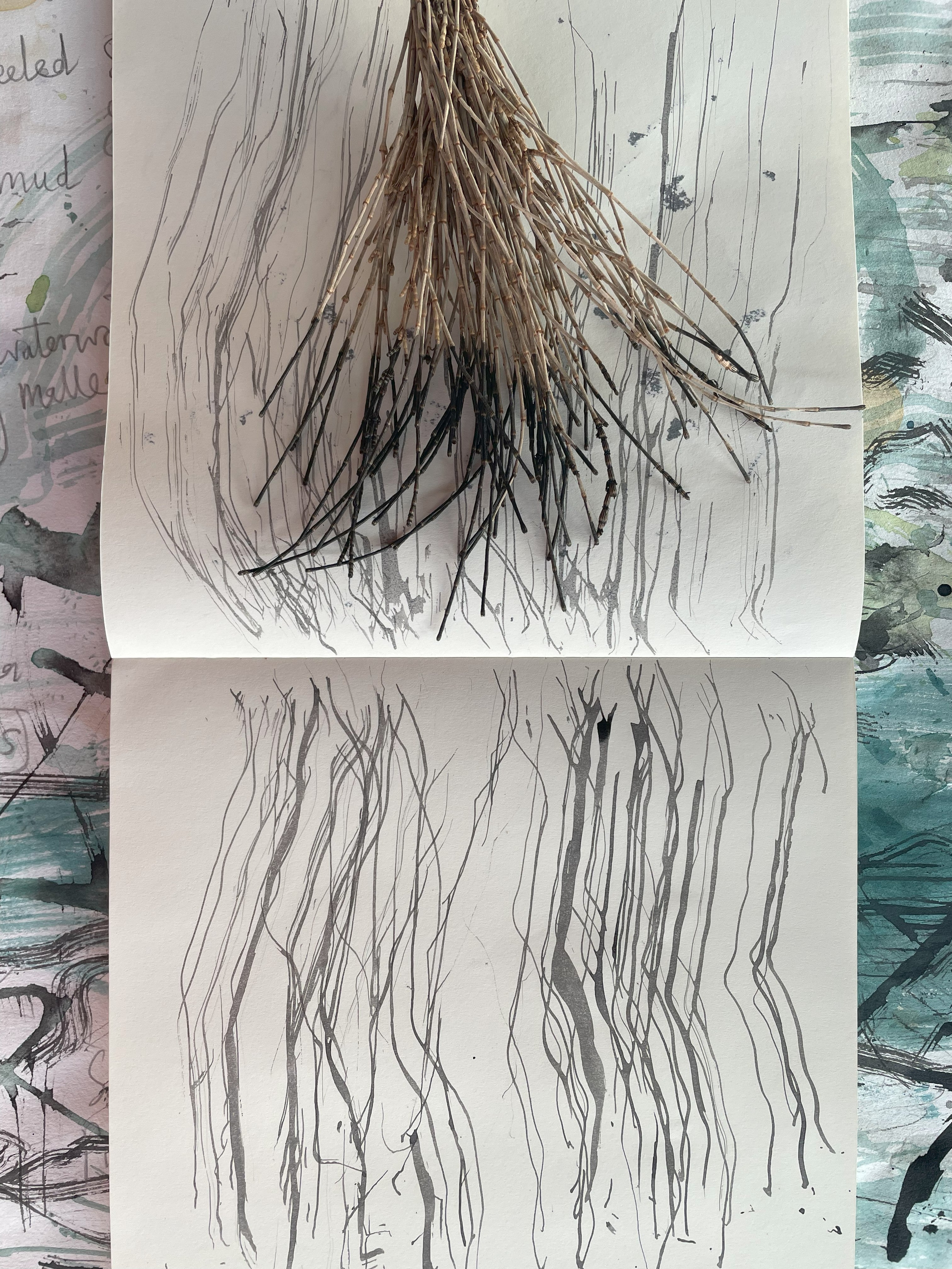 A: I made sure to sleep as much as I needed each day. The comfortable accomodation and waterfront environment was super conducive to rest and relaxation. I’d then make breakfast and coffee and head up to the sweet studio shed which held my drawing kit, to make a plan for the day. My overall plan for the week was to explore some experimental plein air approaches to printmaking using handmade brushes made from locally foraged materials. This entailed daily walks for materials and place-based inspo, so I made sure I learned about local walking loops and places to explore. I treated each day like a working day, blocking out time in the morning to work, have lunch, walk and resume experiments til 4pm. The evenings were for cooking, walks reading and more rest!