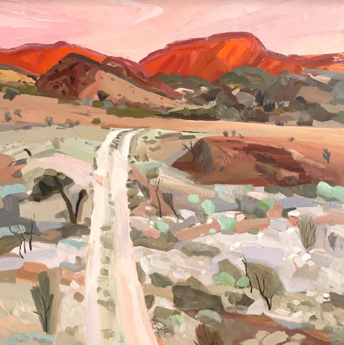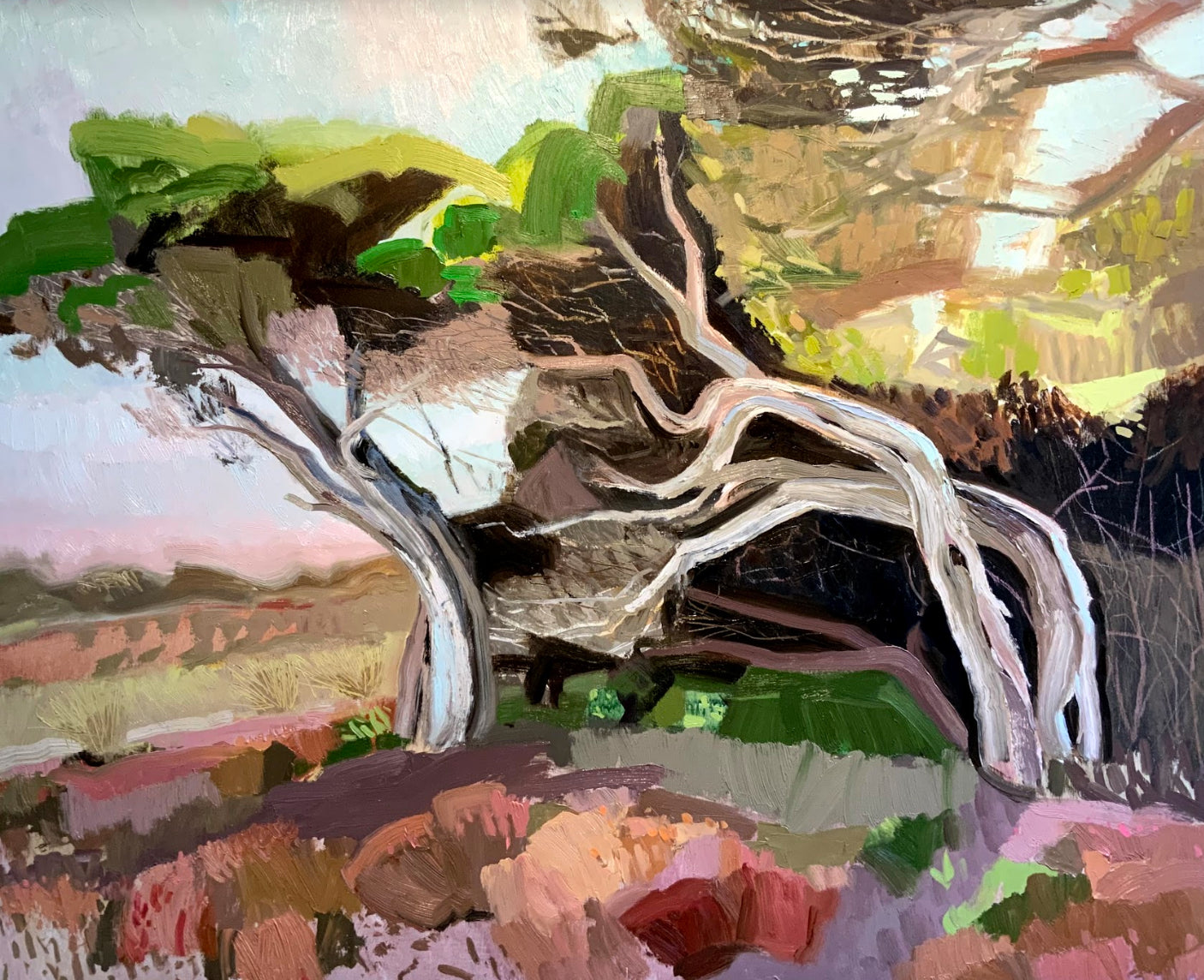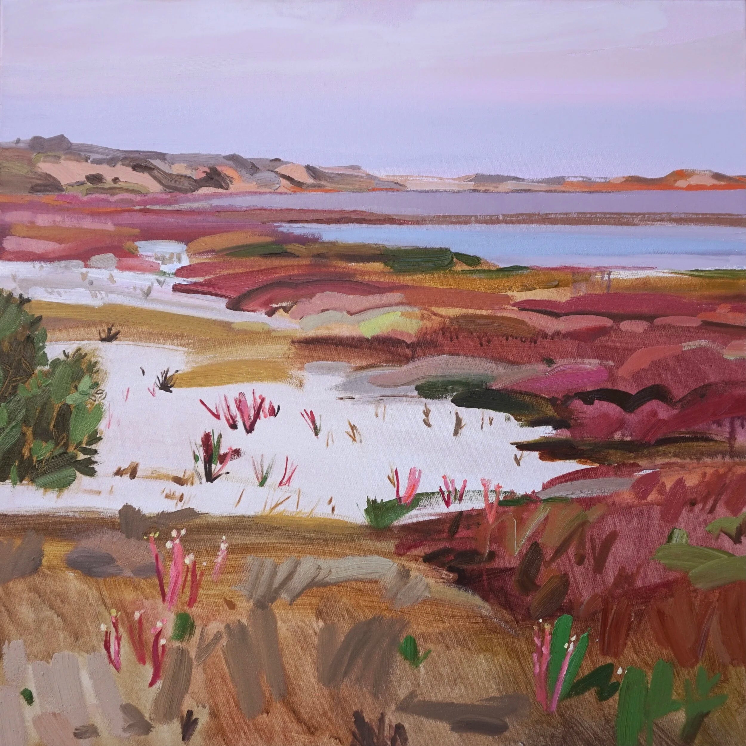 I’m drawn to paint landscapes that I feel a deep connection to. We have a shack in a national park just south of the Coorong that we’ve holidayed in all my life, no power just the sound of the wind, waves and birdsong. As children we spent endless days roaming free on the beaches and dunes, and evenings telling stories around a campfire beneath a sprawling twisted tea tree.